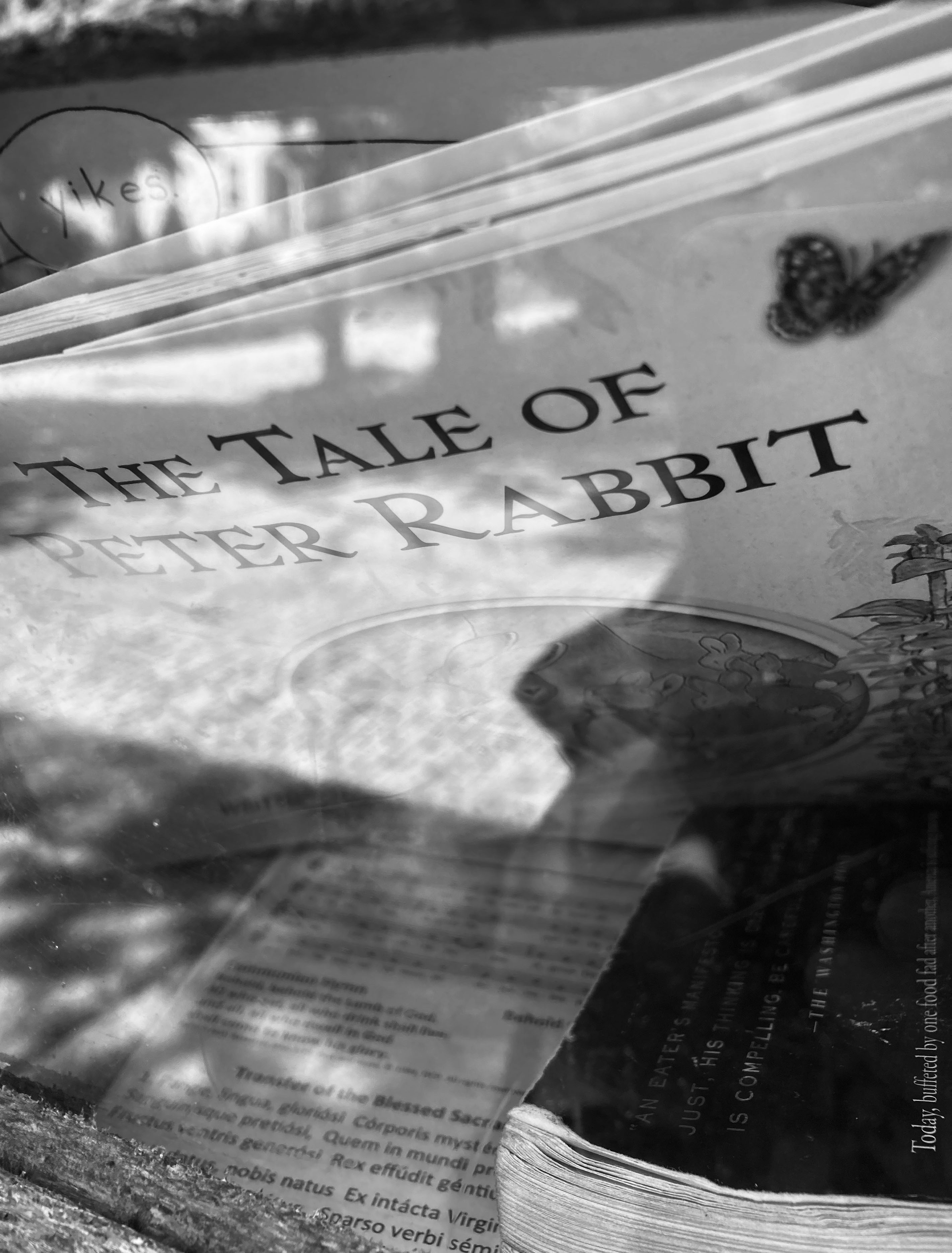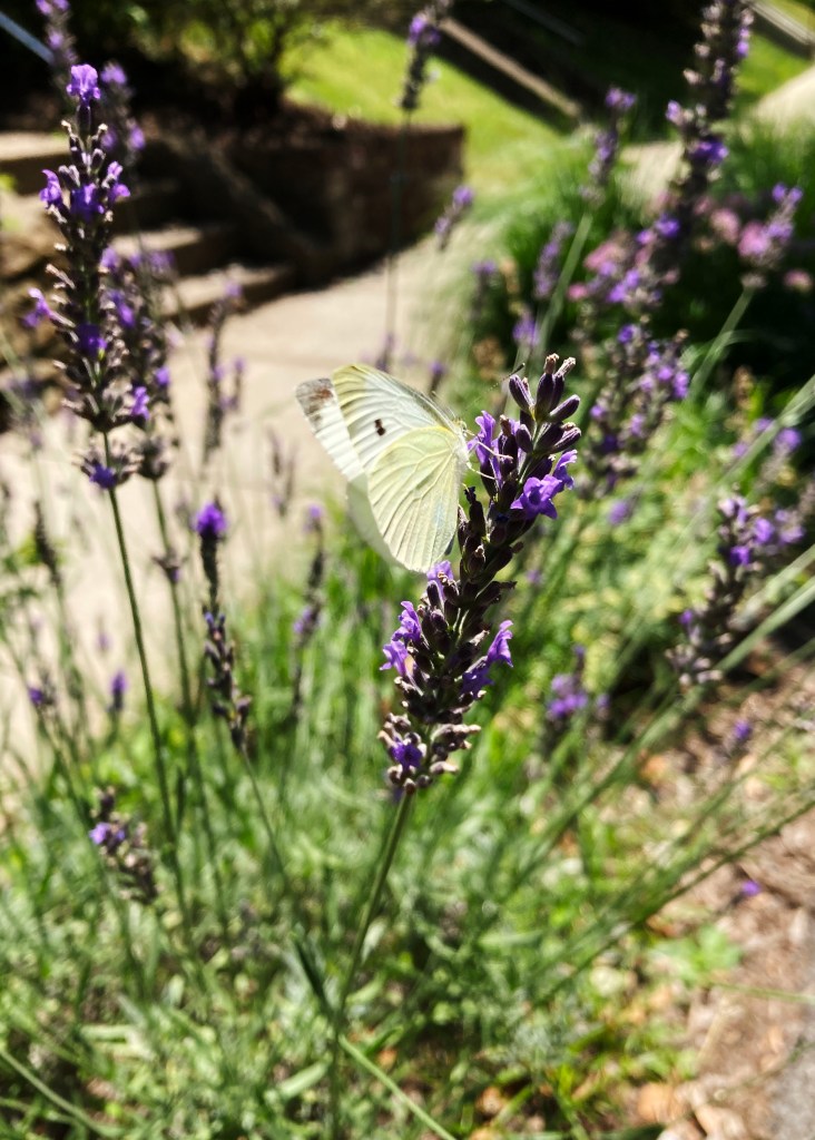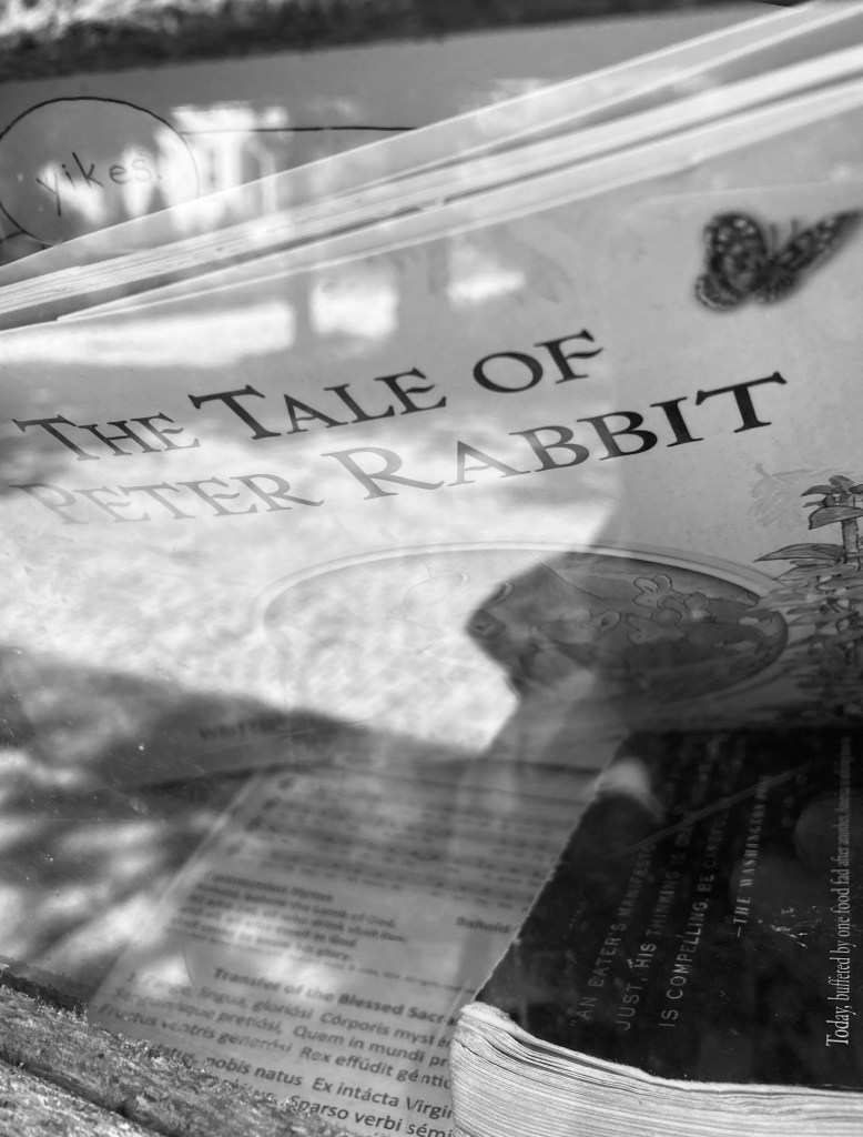 there is the man with the three german shepherds–i pull my own pup away from them, passing the little free library, i see that peter rabbit is keen to be chosen by someone’s tiny curious hands and i think about my own children and how they’ve grown, and how i love them more than i could have ever imagined loving–how watching them fly away and watching them become such good and kind people has been so joyful, but there, a butterfly flits from one stem to another and its soft yellow beauty transfixes me in the moment as i stop to listen to the humming of the bees–juliet pulls on her leash and i see the grey neighborhood cat approaching, so i walk onto the uneven bricks, crossing the street near the bright purple garden, close to where i once photographed a smashed can of orange crush
