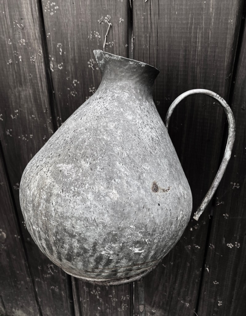 old metal jugs against wood grain