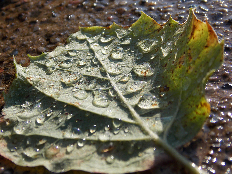 A single rain drop or snowflake or tear stain or puddle splash;