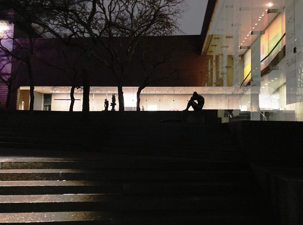 at night, we look at art; women with long dresses and ladders leaning on moons, curled up statues fight the